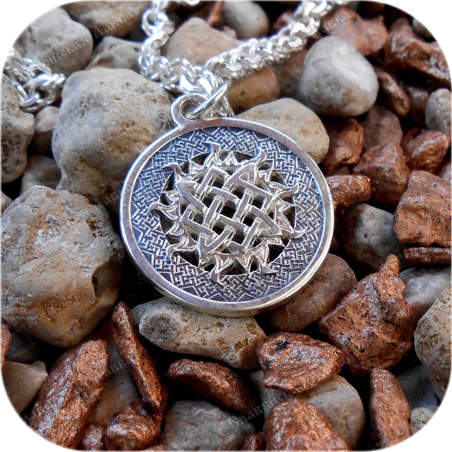 Оберег из серебра в виде круга с «горящим» внутри Солнцем, в которое, в свою очередь, заключён славянский символ «Квадрат Сварога». Причём в качестве орнамента выступает ещё один известный символ - Цветок Папоротника. Таким образом, оберег обладает тройной защитой.
