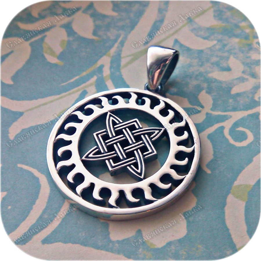 Оберег из серебра в виде Солнца с «горящим» внутри славянским символом «Звезда Сварога».