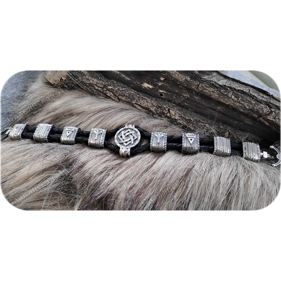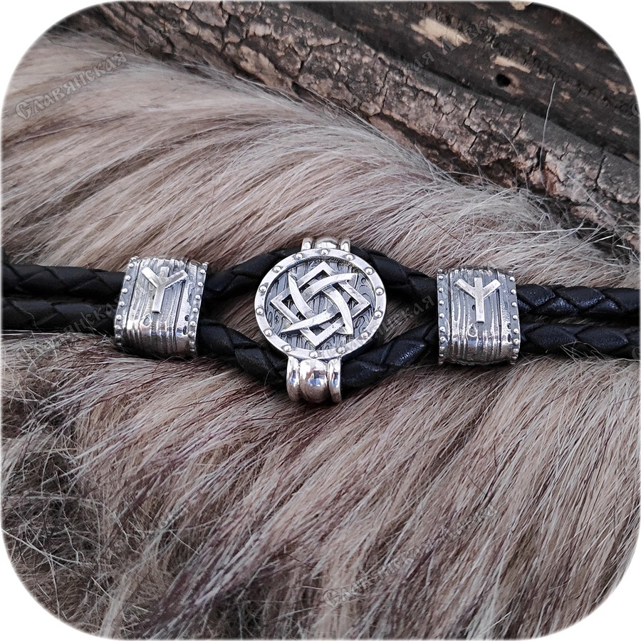 Плетёный кожаный браслет с серебряной вставкой с символом «Квадрат Сварога». Данный знак приносит равновесие и спокойствие в семейную жизнь, и, по легендам, позволяет налаживать связь с предками. Носящий «Квадрат Сварога» тем самым показывает богам, что он гордится своей культурой и родом, является хранителем семейного очага и родной земли. Браслет в стандартном варианте содержит только две дополнительных бусины (доступны варианты с символами из списка или без нанесённых символов). Всего на данный браслет можно прикрепить до 8 бусин в любых вариациях. Каждая бусина представляет из себя серебряное изделие размером 11 на 16 мм, центральная вставка также выполнена из серебра и имеет размер 20 мм. Замки, разумеется, серебряные, на нижних фото показаны их типы крепления - Круг/Якорь и Коробка (защёлка).