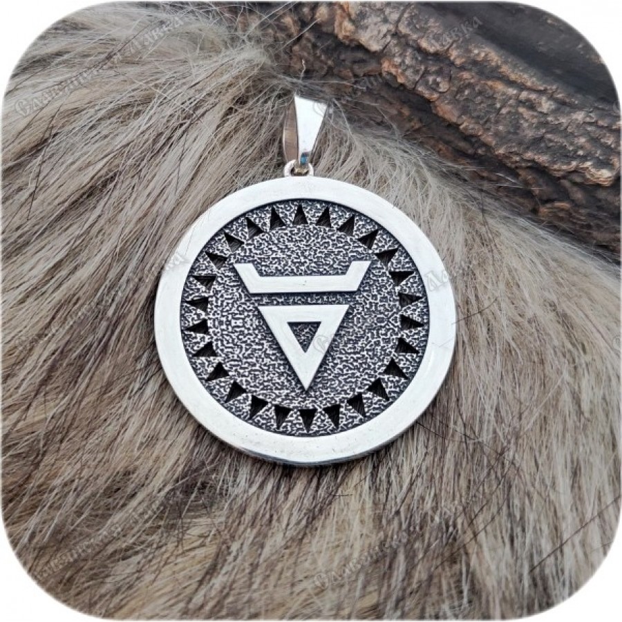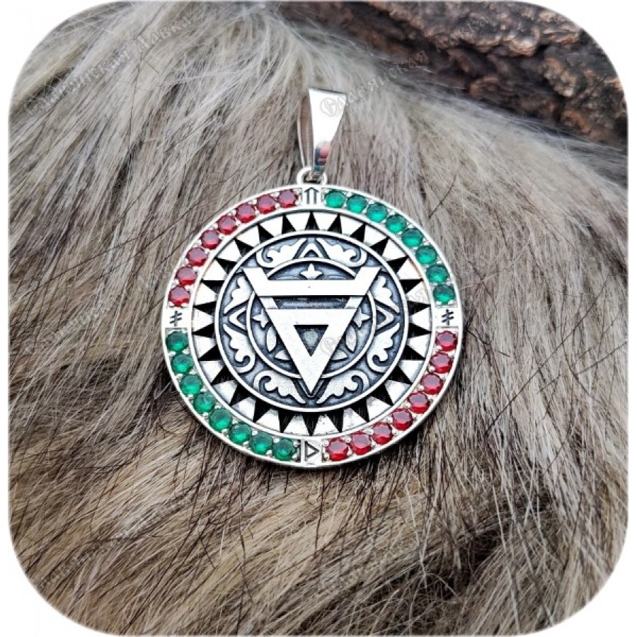 Этот оберег – словно застывшая песнь солнца. Символ Велеса, выгравированный на искусно выполненной подложке, окружен стилизованными лучами, дарящими свет и надежду. Изысканная окантовка, украшенная рунами Даждьбога, Опоры и Ветра, рассказывает свою историю, а сияние красных и зеленых фианитов добавляет оберегу праздничности и волшебства.
