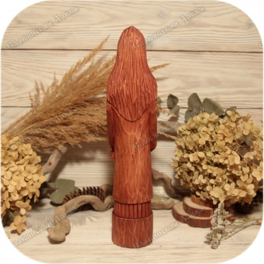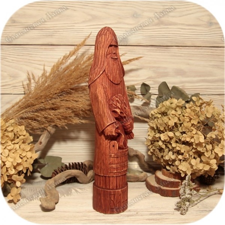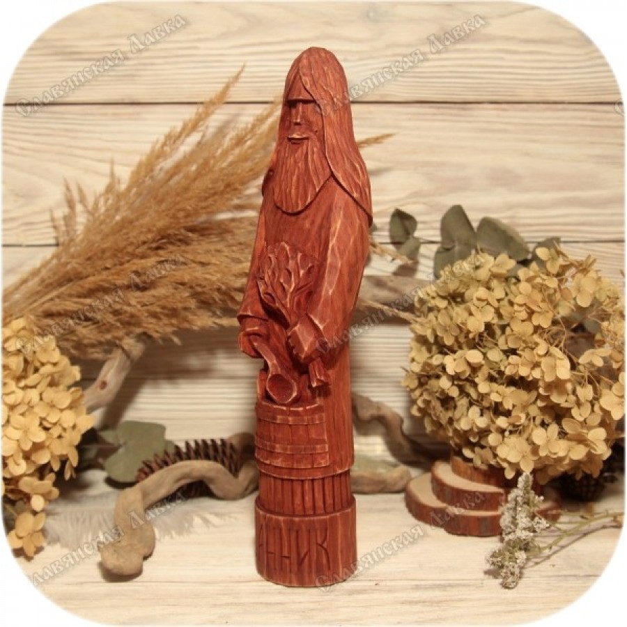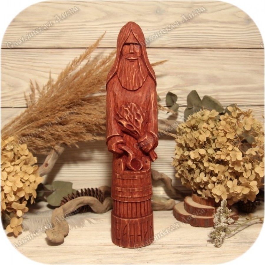 Издавна Банника почитали как хранителя бани, дарующего мягкий пар, тепло и покой. Кто из русских не питает любви к бане? Ответ очевиден. Именно поэтому данный кумир станет превосходным подарком для хозяина, недавно воздвигшего свою парную. Изделие выполнено в строгом соответствии с канонами, хранящими традиции резьбы по дереву, и является результатом кропотливого ручного труда.