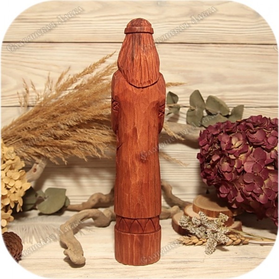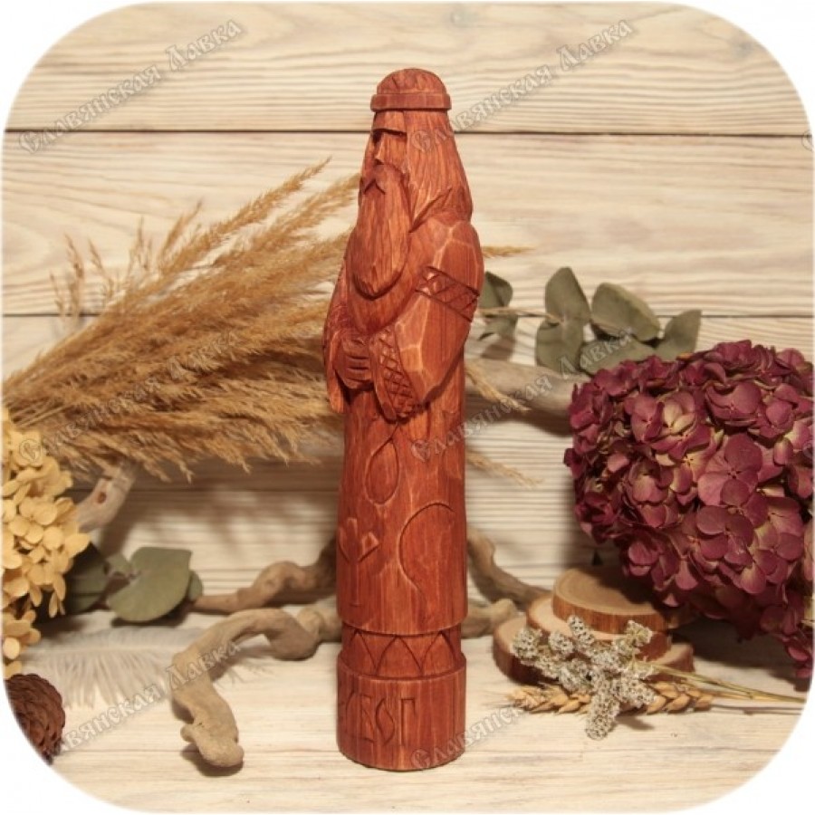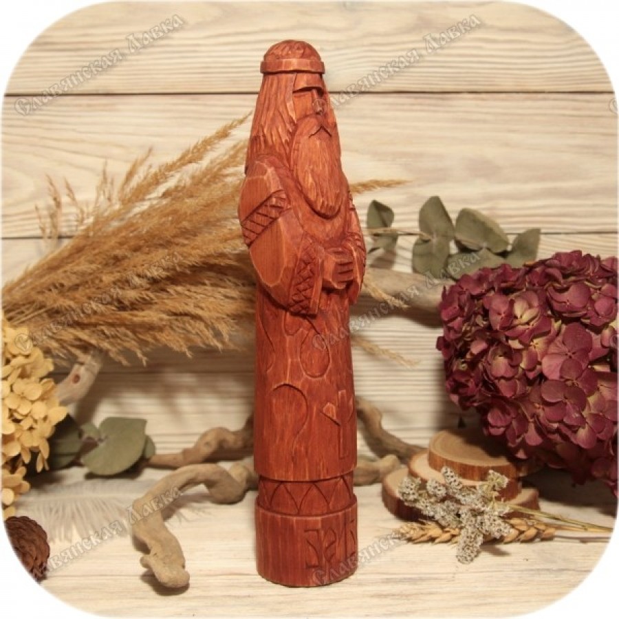 Представлен искусно выполненный кумир славянского бога Белбога, воплощающий лаконичность и глубокий смысл. Перед взором предстает старец, облаченный в традиционные славянские одеяния. Его тело украшает стилизованный рисунок, напоминающий Древо Жизни, символ связи миров и поколений. В самом сердце кумира вырезана руна Мир, олицетворяющая порядок и гармонию, ключевое понятие в мировоззрении Белбога. Завершает композицию искусно нанесенный славянский орнамент, а имя бога, вырезанное на постаменте, придает кумиру завершенность и значимость.