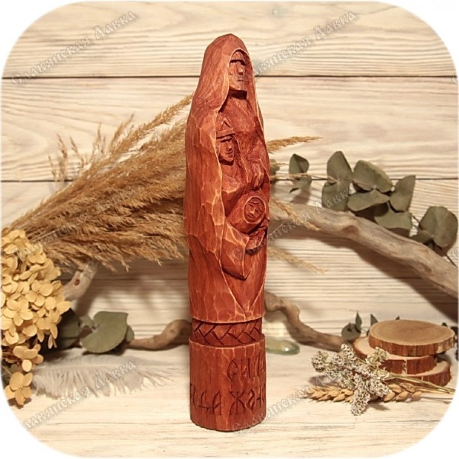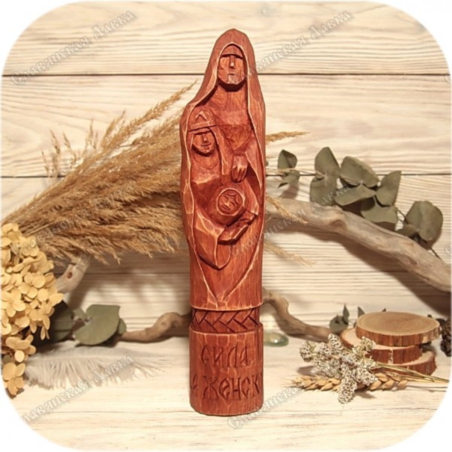 Кумир вырезан из благородного кедра, скульптурная резьба дышит жизнью. В основании статуэтки – изящная порезка в виде косы, символизирующая связь поколений. На постаменте вырезано заветное название: «Сила Рода Женского». Этот кумир станет достойным украшением домашнего святилища, оберегающим ваш род и дарующим ему процветание.