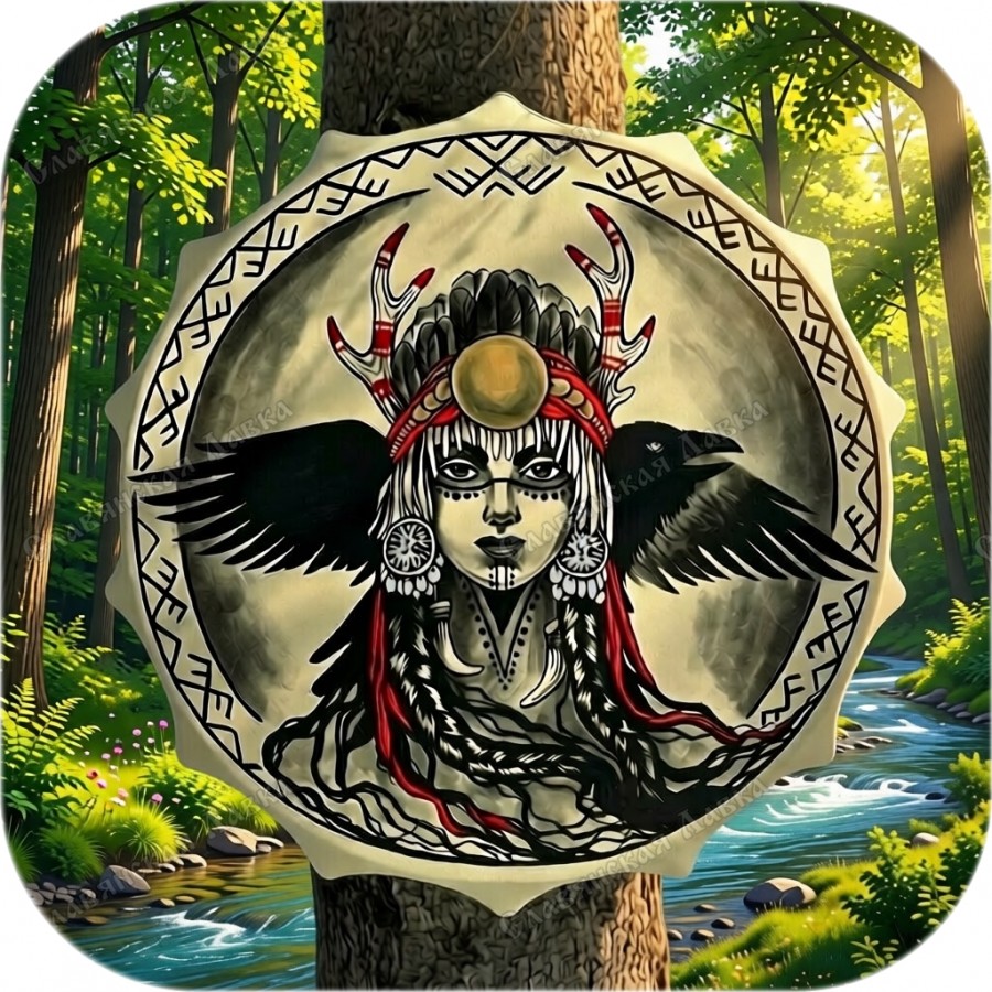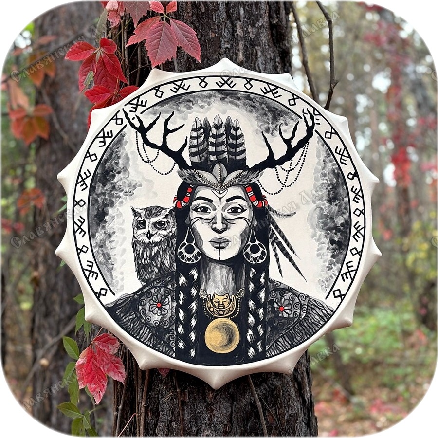 Оформлен бубен отличным рисунком от нашей талантливой художницы Алёнушки. Композиция и исполнение - полностью авторские и не привязаны к конкретной культуре, с одной стороны, но не забыты все важные атрибуты - с другой. Общий концептуальный смысл можно понимать по-разному, но основных вариаций две (и они вполне могут соседствовать между собой). Первая - это бубен непосредственно для шаманок, как и отражено в названии. Женщины-шаманы в национальной культуре - довольно редкое явление, но в фольклоре народов Сибири и Севера, что характерно, есть упоминания о особо могущественных шаманах именно женского пола. Вторая вариация композиции связана с тем, что бубен часто одухотворяется, и если ему придан женский образ, это также вполне вписывается в традицию. Исходя из этого, данный бубен подойдёт всем, кому приглянётся данный рисунок.