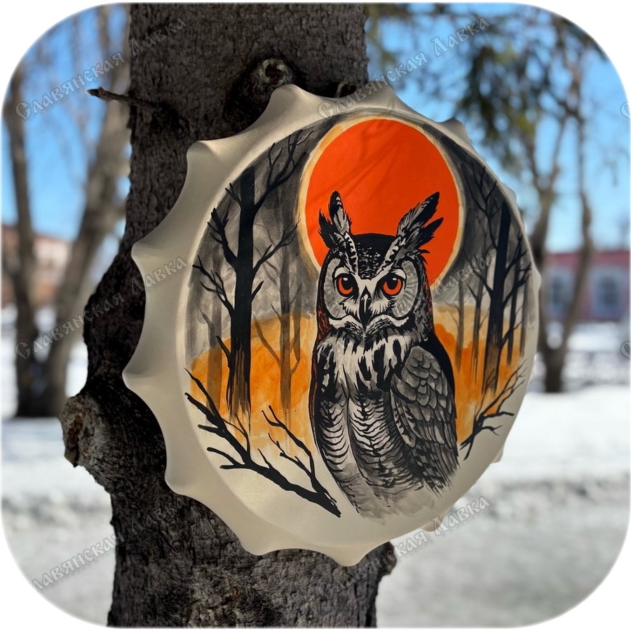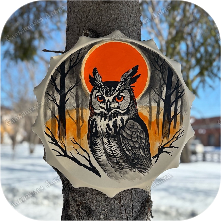 Бубен имеет удивительной выразительности рисунок совы. Она как живая! Очень мудрый взгляд и статный образ! Очень детализировано изображение при условии, что это ручная роспись.