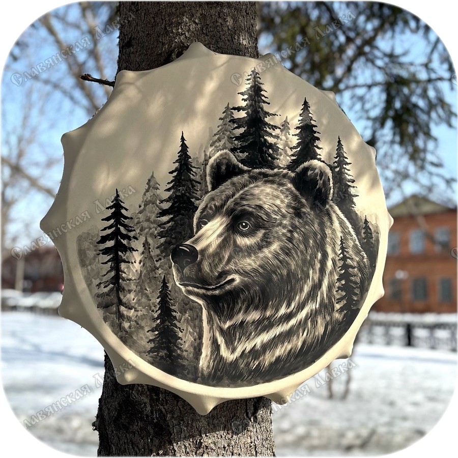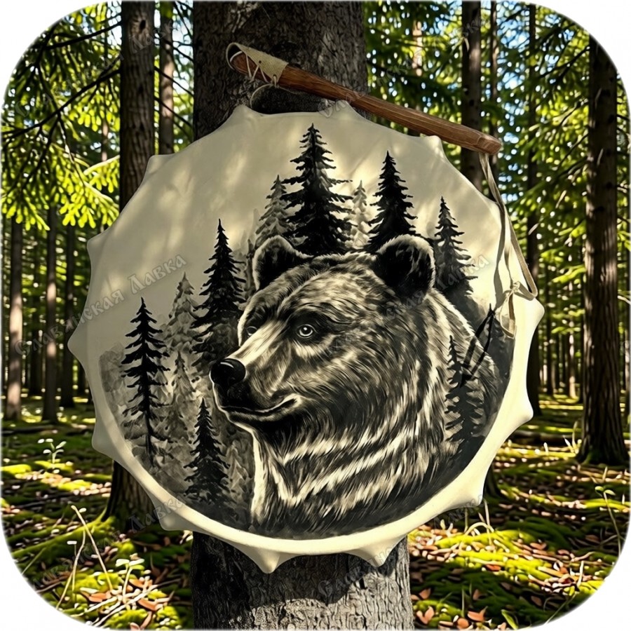 Рисунок на бубне выполнен особенно тщательно и детализация порадует. Краска на бубен наносится вручную. Концепция рисунка направлена на слияние медведя с тайгой. Отсюда и название данного музыкального инструмента.