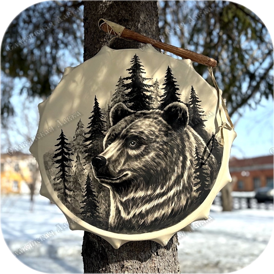 Мы продолжаем публиковать линейку наших бубнов с отличными рисунками. Перед Вами отличный вариант, для, которые почитают тотем медведя. Данная модель изготавливается только на бежевой коже так как рисунок будет смотреться только в таком виде как представлен сейчас на сайте.