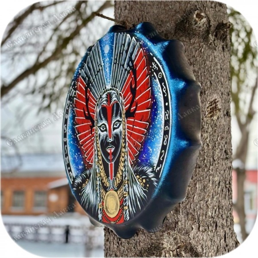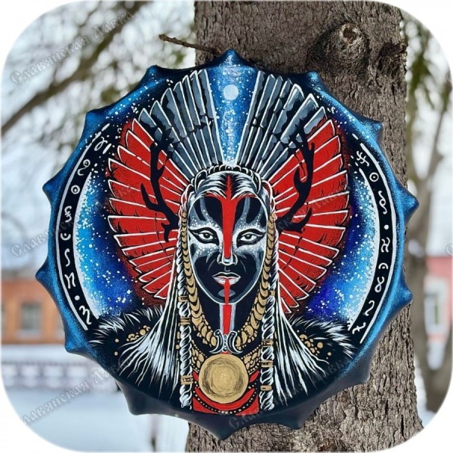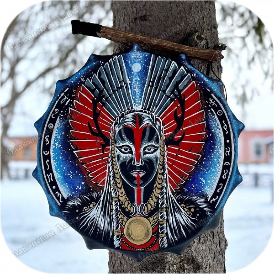 Представляем вашему вниманию бубен «Темный Шаман». Это мистический портал между мирами, перед нами шаман в образе оленя. Взгляните на его тело – ритуальные тату хранят древние знания, а на груди сияет оберег – зеркало шамана, отражающее потусторонние силы. Композиция словно застывший миг – шаман уже совершил свой переход.