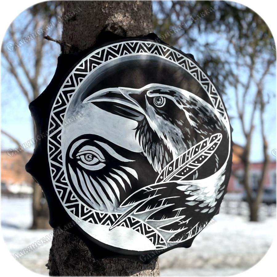 Бубен, такой как «Ворон Одина», – пожалуй, главный инструмент в магическом арсенале любого достойного шамана. С его помощью шаман проводит ритуалы и общается с миром духов, а также может говорить с богами. Бубен специально устроен так, чтобы издавать ритмичные монотонные звуки, вводящие в транс слушателя и позволяющие выходить из тела шаману. Бубен «Ворон Одина» сделан из кожи молодого алтайского теленка и натянут по древним технологиям.