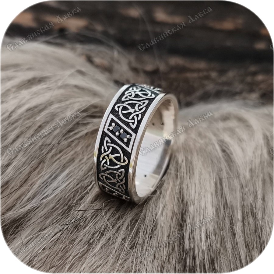 Вот кольцо, исполненное в духе славяно-скандинавской эстетики. Оно носит имя «Триглав» — так именуется вязевый узор, опоясывающий его стороны. Этот символ, одинаково почитаемый в обеих культурах, олицетворяет связь между мирами, место, где покоится камень Алатырь. Считается, что он генерирует неисчерпаемый запас магической силы.
