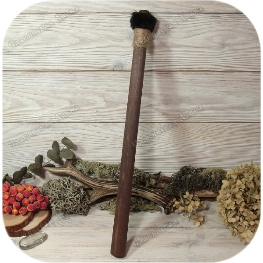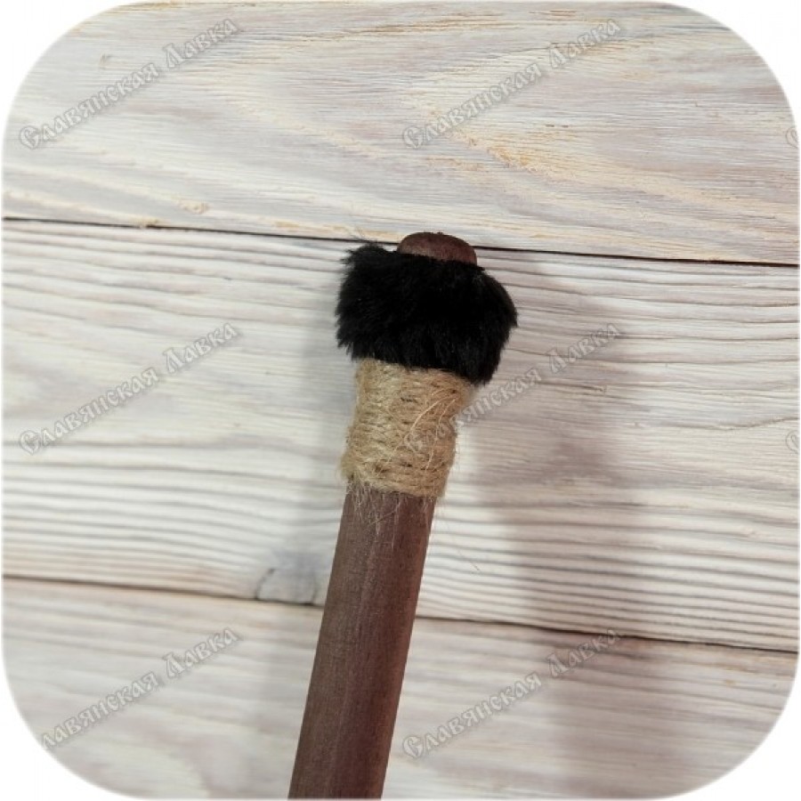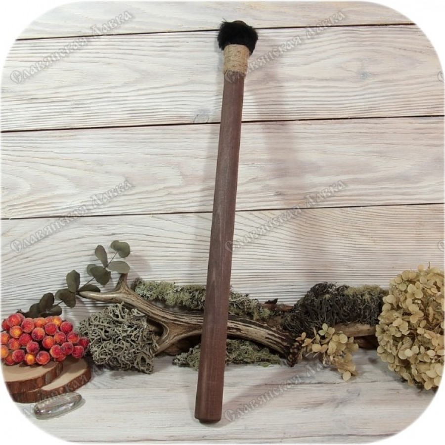 Создаются различные колотушки, каждая из которых предназначена для определенных целей. Перед вами — эталон колотушки, в котором мы стремились воплотить классическую форму и привлекательный внешний вид. Основные характеристики включают прямую форму и ударную часть, обитую мехом. Достаточная длина обеспечивает удобство работы с бубнами диаметром 40-70 см, а оптимальный вес позволяет извлекать у инструмента естественное, околобасовое звучание.