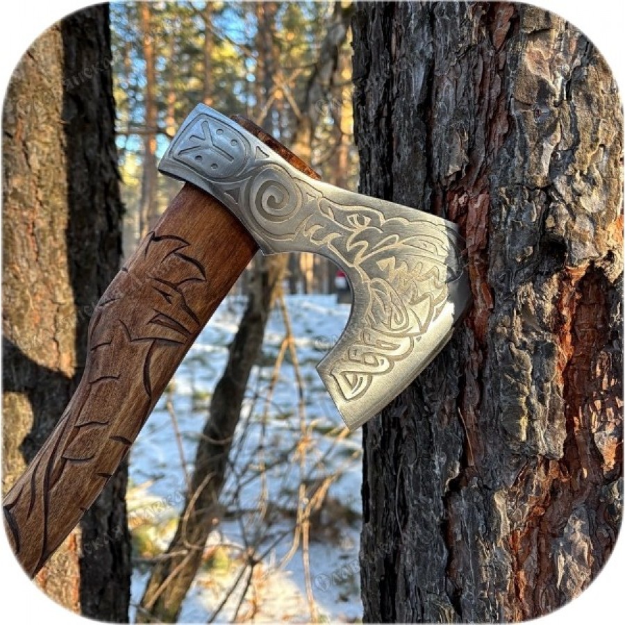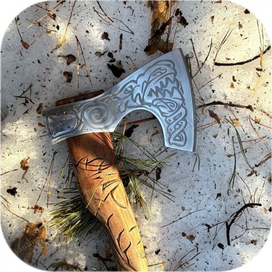 Кованый скандинавский топор с именем в честь Ужасного Волка - «Фенрир». Изделие отличается от обычного другой ручкой - увеличенной длины (45 см). Такая ручка лучше подходит и для колки дров, и для применения в боях (реконструкторских, разумеется). Она удобная, изготовлена из берёзы, произведена простая, но полноценная резьба. Это делает этот топор более заметным, значимым и законченным.