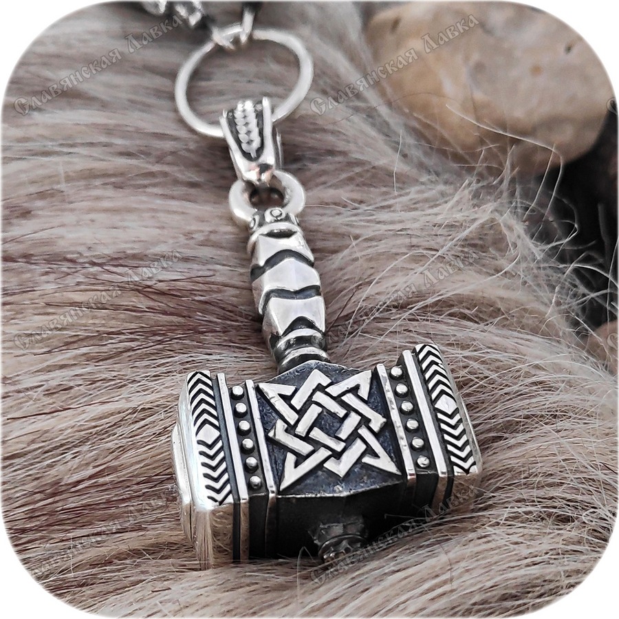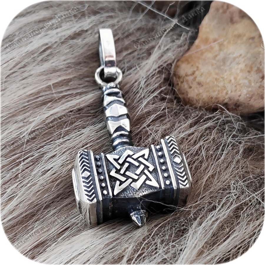 Кулон из серебра в виде молота, такого, каким бы он выглядел в руках славянского бога Сварога. Молот украшен символом Звезда Руси.