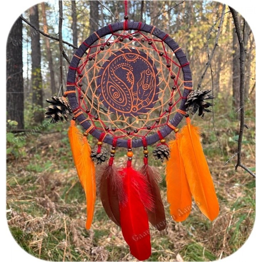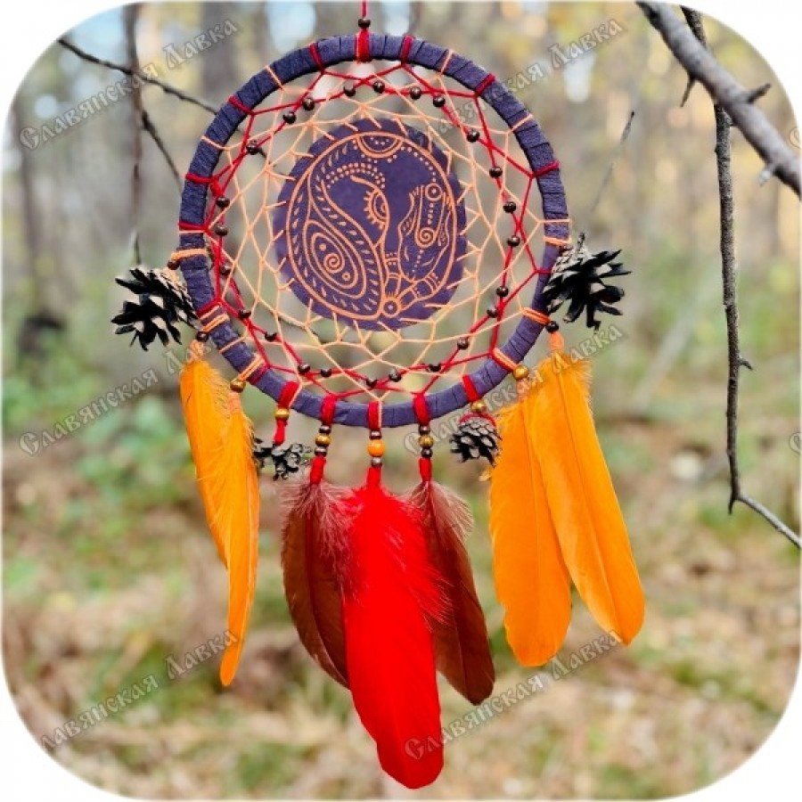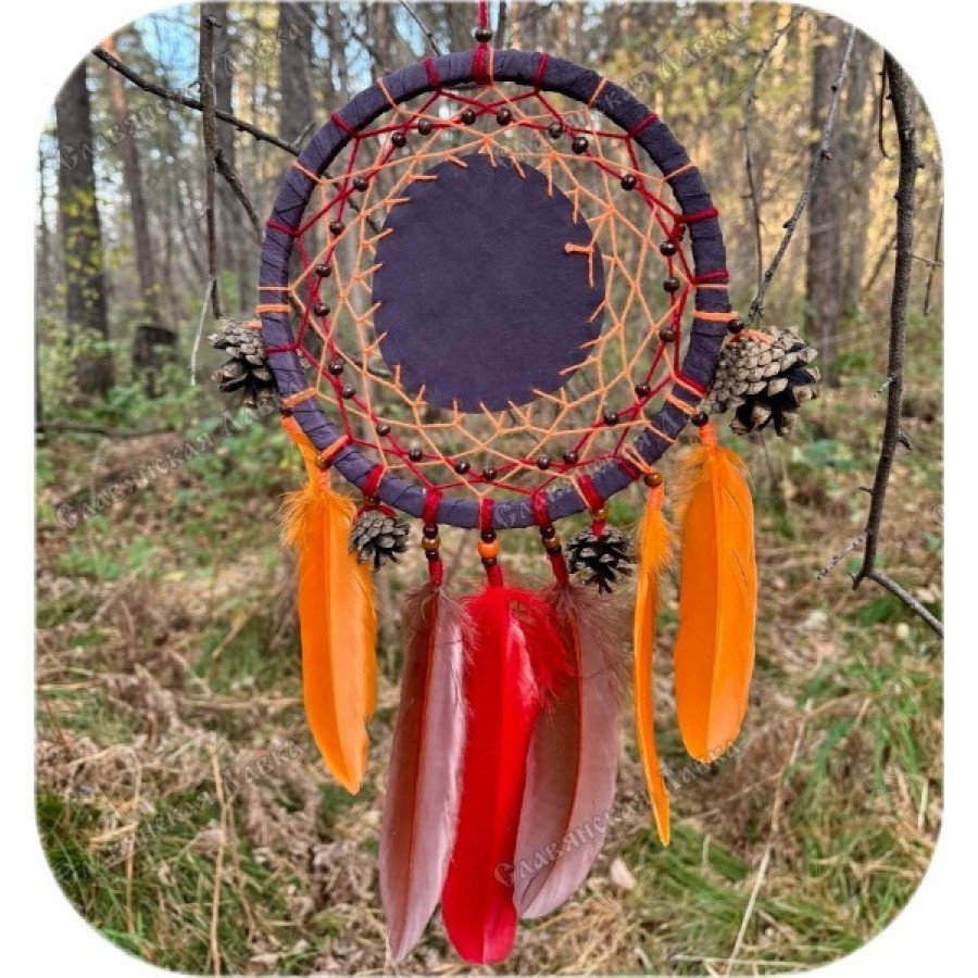 Завершают это произведение искусства перья, горящие всеми оттенками заката – красным, желтым и оранжевым, и лесные шишки, словно миниатюрные ежики, притаившиеся в ожидании зимы. Вся композиция дышит гармонией и завершенностью, словно мелодия, доведенная до совершенства. Вы не найдете нигде столь продуманных, одухотворенных вещей для дома, созданных руками мастера, а не бездушным станком. Это не просто ловец снов – это кусочек волшебства, сотканный для вас!