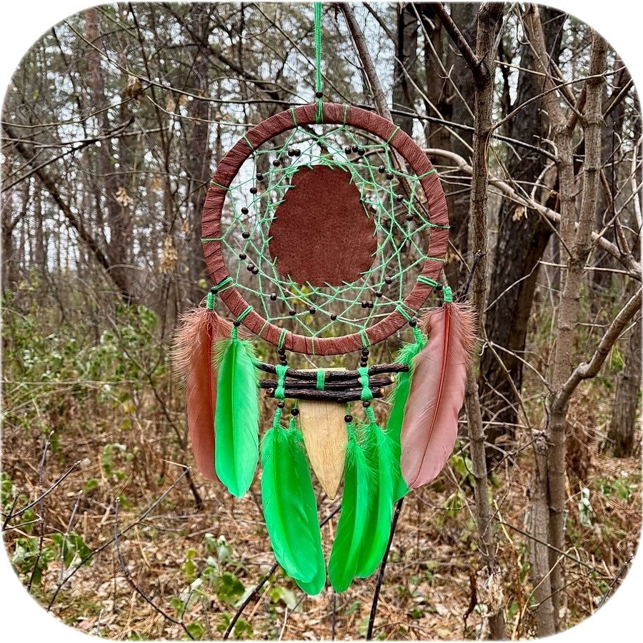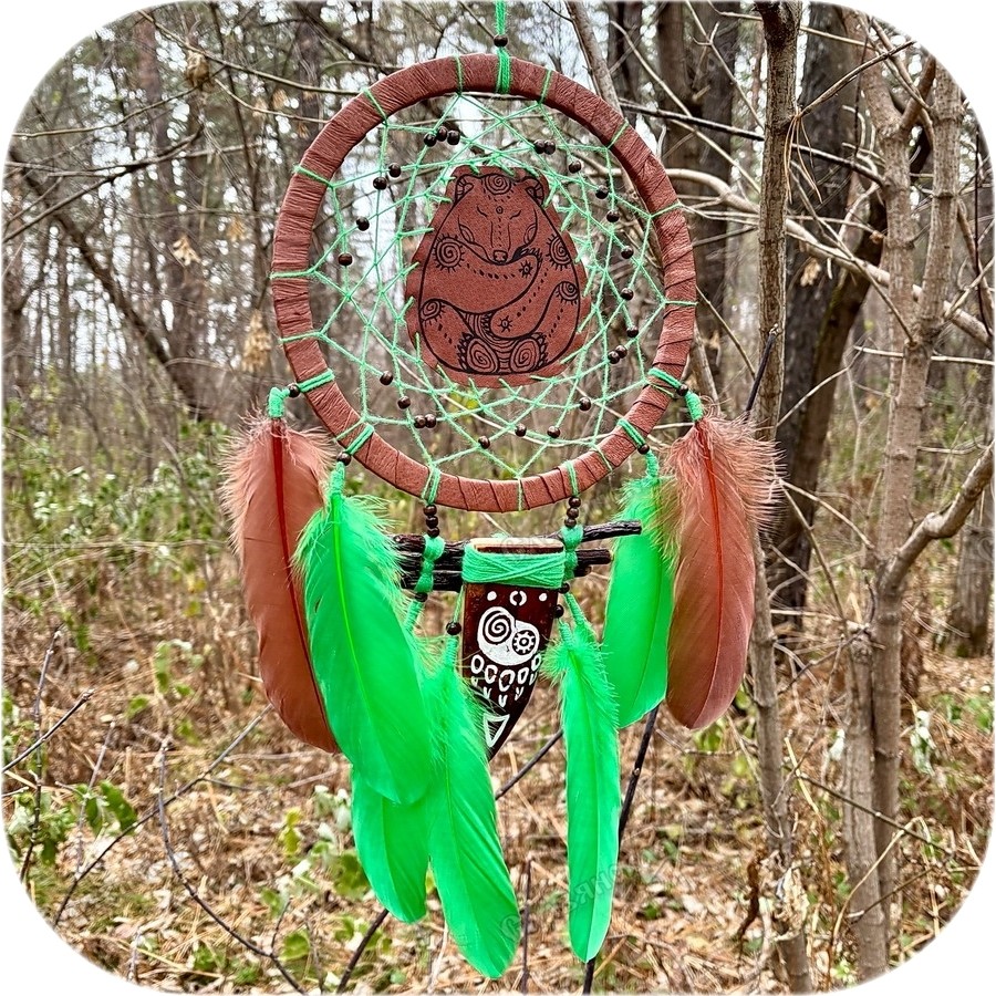 В основе композиции — классический круг, внутри которого раскинулась филигранная паутина. Обод искусно обвит тончайшей кожей приглушённого коричневого оттенка. В самом центре, на кожаном полотне, запечатлён образ медведя, исполненный с особым вниманием к деталям. Обилие тщательно подобранных перьев и деревянных бусин дополняют образ, придавая ему глубину и характер.