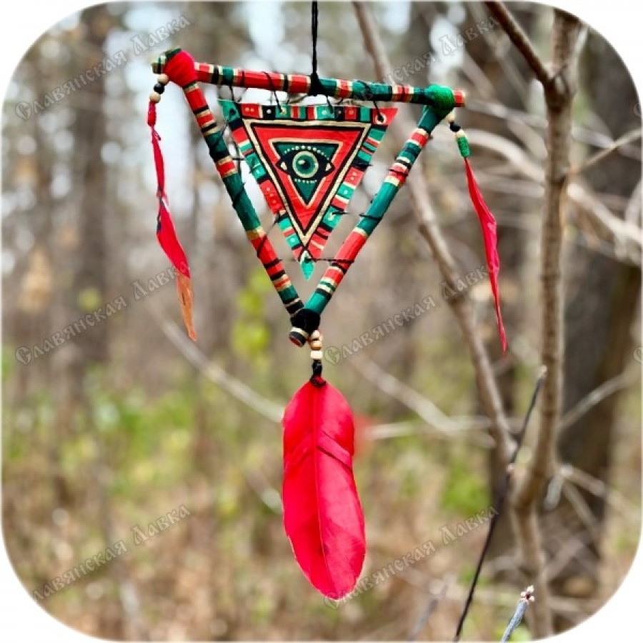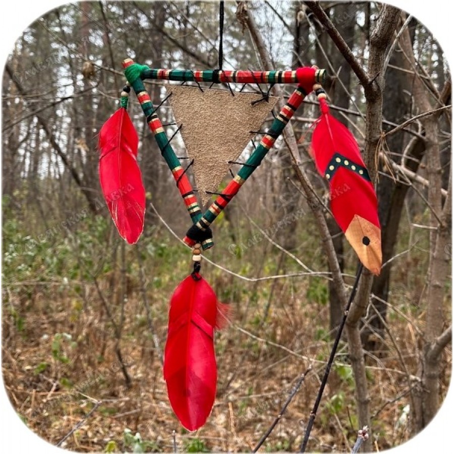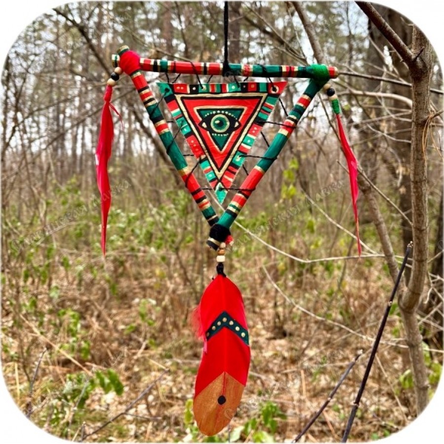 Зелёно-красный треугольный ловец снов представляет собой уникальное переосмысление традиционного амулета. Отклоняясь от общепринятой круглой формы и классического плетения, изделие, тем не менее, несёт в себе дух и замысел, присущие настоящему ловцу снов.