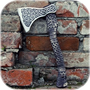 Этот топор больше делался для охотников и почитателей бога Велеса. Это уже серьёзный, достаточно тяжелый топор. Он пригоден как для плотницких дел, так и для организации костра в кемпинге. Конечно, можно таким топором порубить тушку на удачной охоте. Нужно опять подчеркнуть, что травление и чернение с двух сторон и достаточно глубоко. Но как этот, так и все наши топоры производятся вручную. На топоре можно видеть плетёный лесной рисунок и в центре топора - лапу медведя. Такая вещь будет отличным подарком охотнику! И только подумайте, мы можем как на топоре, так и на топорище указать инициалы или дарственную надпись по желанию заказчика!