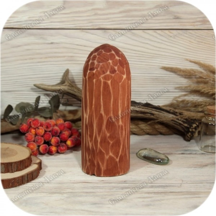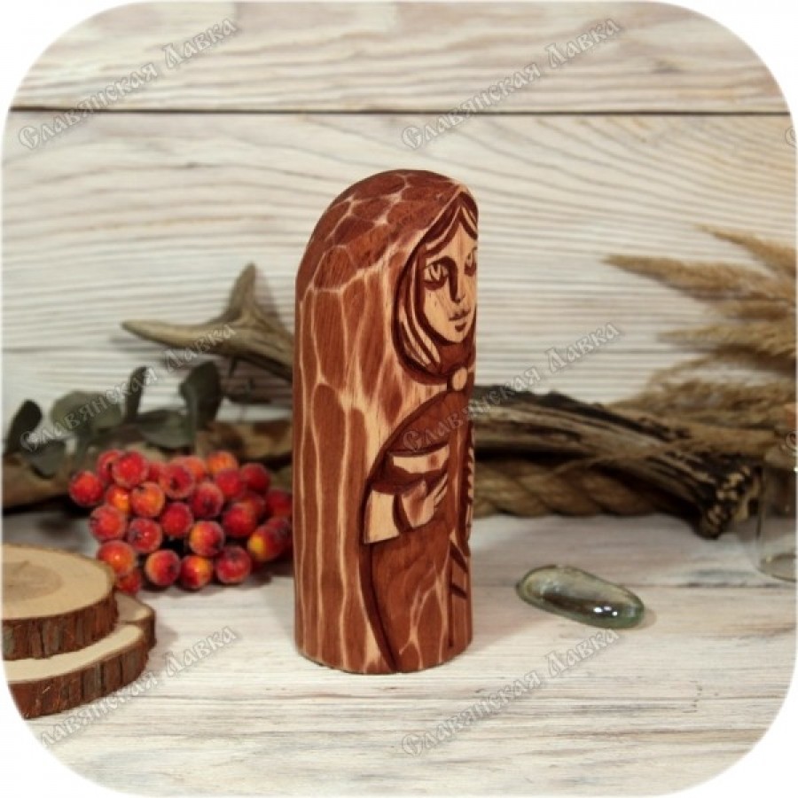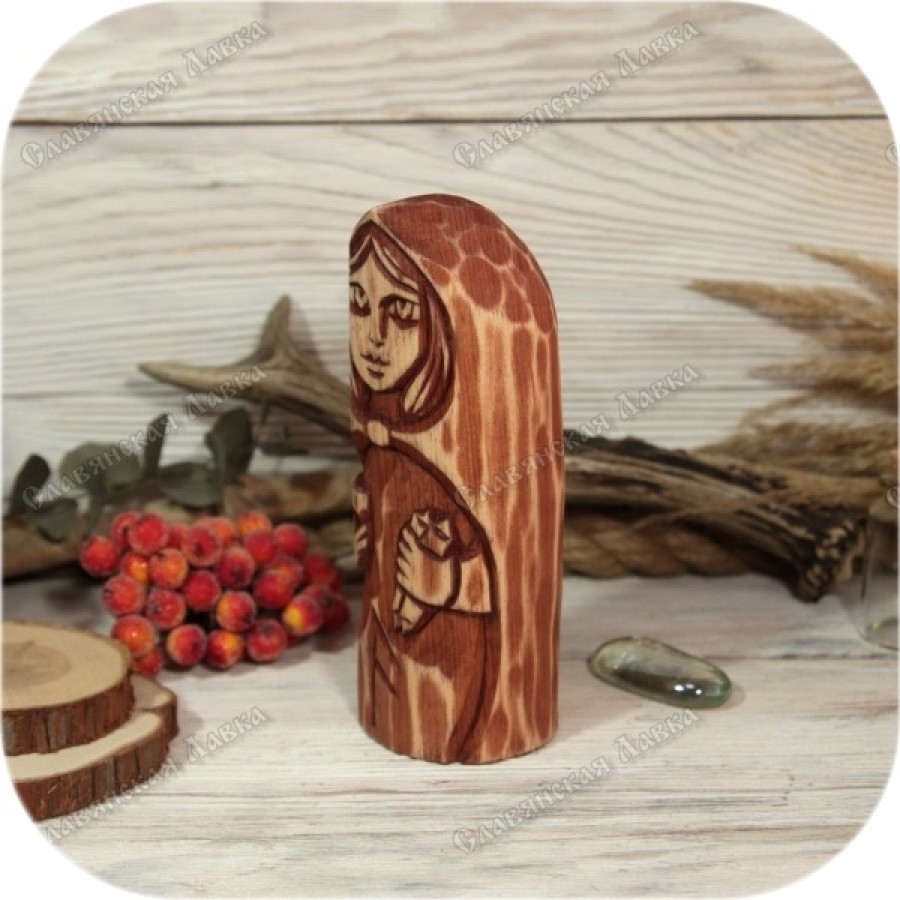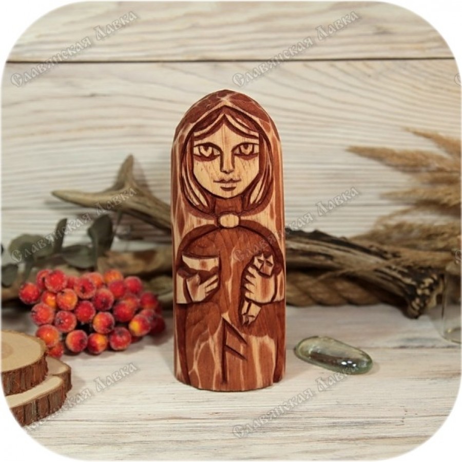 Резной идол скандинавской богини Вёр, несмотря на скромный формат – всего 14-15 см – являет собой образ доброй и ведающей покровительницы знаний. Богиня предстает с чашей и веретеном в руках, символами гадания и ворожбы, погружающими в мир тайн и предсказаний. Одеяние её – традиционный плащ европейского покроя. Лик украшен руной Ансуз, печатью мудрости и вдохновения.