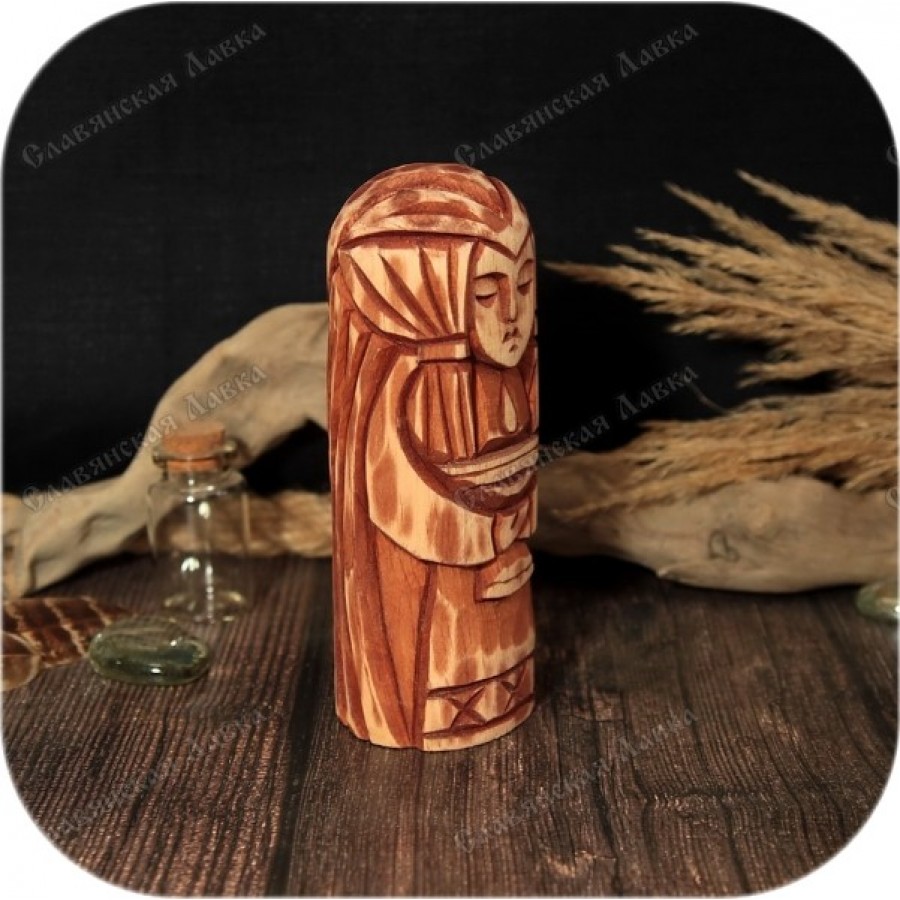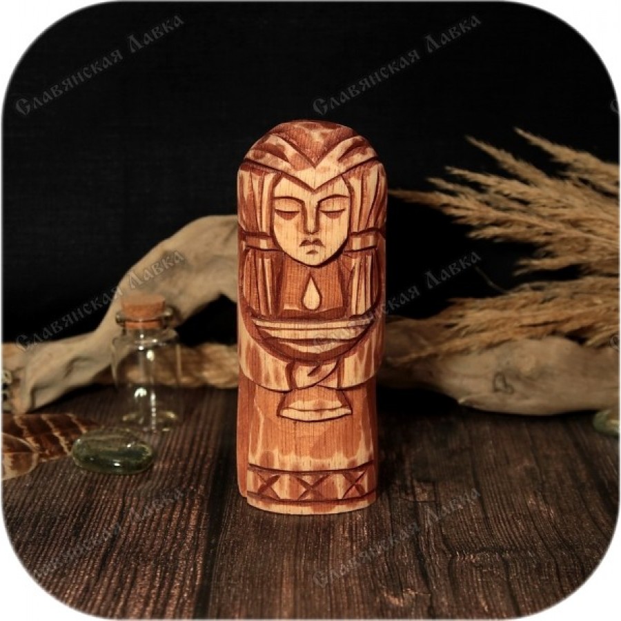 Кумир Сигюн искусно вырезан из кедра, демонстрируя высочайшее мастерство исполнения деталей. Особое внимание уделено проработке лица, волос и, конечно же, чаши — ключевого символа, связанного с богиней. Согласно мифам, Сигюн подставляла свою чашу под капли яда, предназначенные для Локи, подвергнутого наказанию богами Асгарда. Сигюн, супруга Локи, воплощает собой верность, преданность и безграничную любовь. Ее имя, переводящееся как «победоносная подруга», превосходно отражает ее суть.