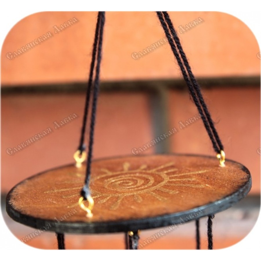 Музыка ветра «Солнце» — гармоничное изделие, оправдывающее своё название изображением лучистого светила на основании, к которому крепятся издающие мелодичный звон ветви. Множество ветвей различной длины, выполненных в едином стиле, вторят друг другу в унисон с дуновением ветра. Чёрно-золотая палитра пронизывает всё изделие, придавая ему изысканный вид.