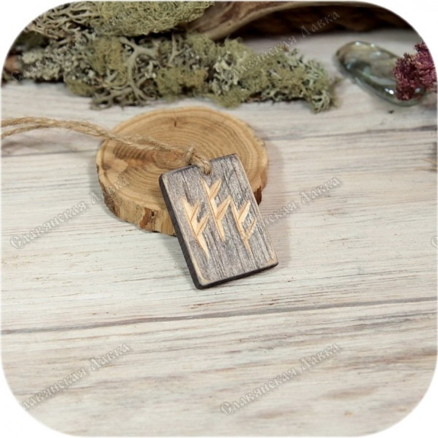 Оберег украшен подвесом из пеньковой нити и тремя рунами Феха, вырезанными таким образом, чтобы подчеркнуть естественную текстуру и глубину материала. Эта традиционная скандинавская руна символизирует обретение богатства и духовной силы, а использование кедра, известного своими энергетическими свойствами, значительно усиливает магические свойства предмета.
