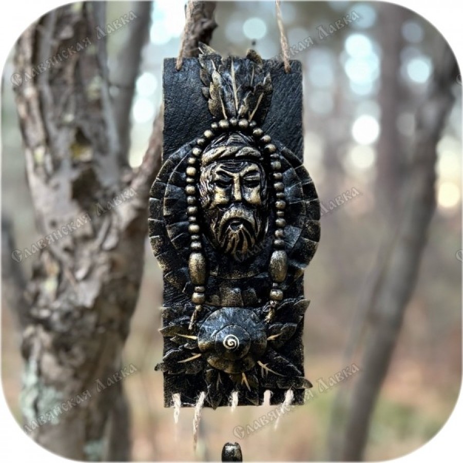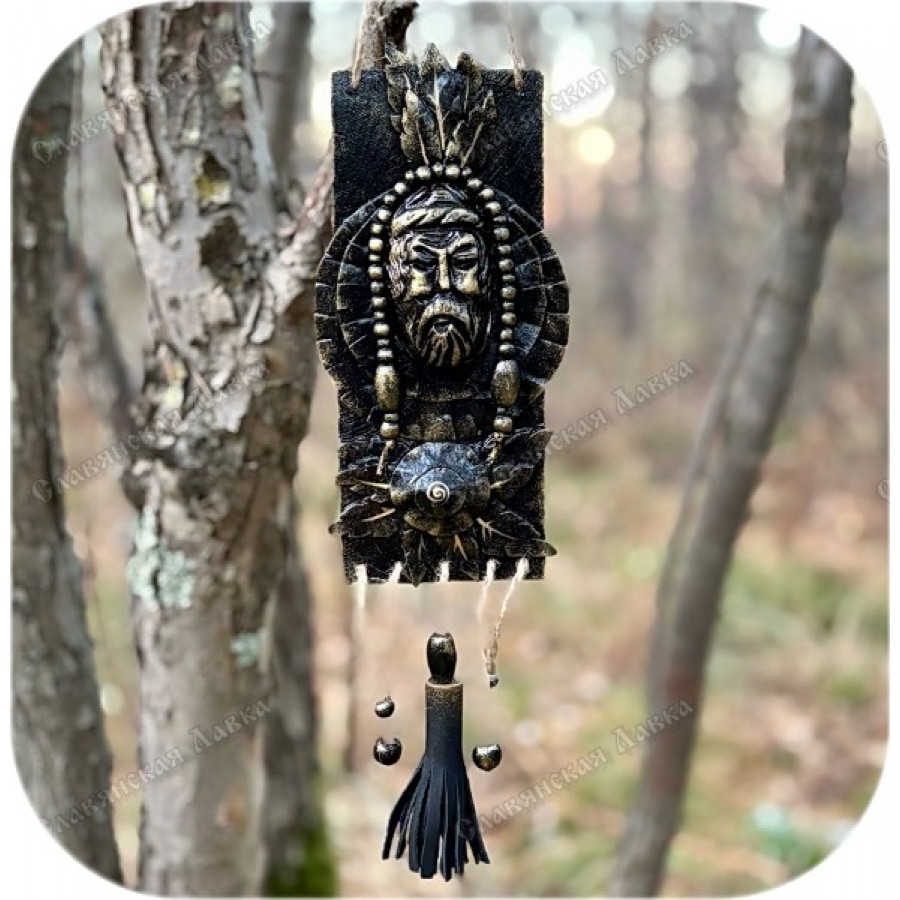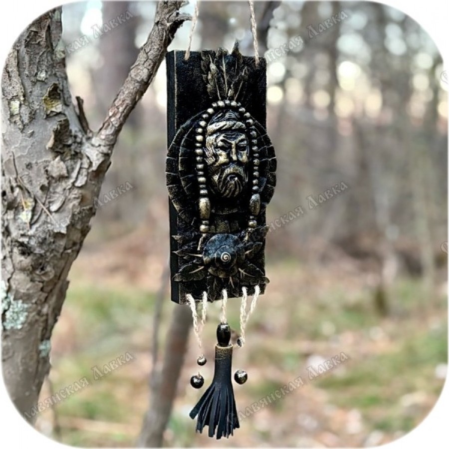 Панно украшено кожаными привесками ручной работы, деревянными бусинами и росписью, выполненной с вниманием к мельчайшим деталям. Каждый элемент декора подчёркивает уникальность произведения и придаёт ему неповторимый характер.