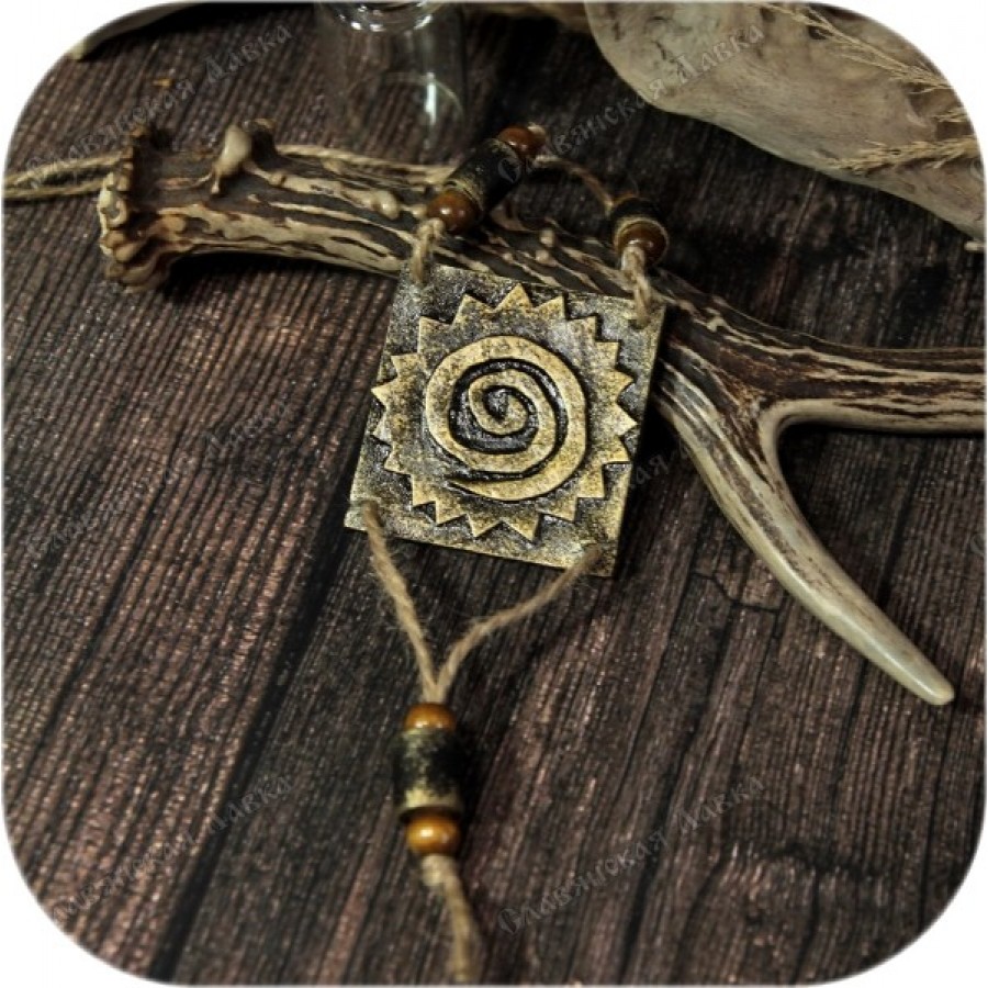 Данный оберег — результат кропотливой ручной работы нашей искусной мастерицы. Основой послужила натуральная кожа, из которой в несколько слоев была создана сама подвеска. Особая техника тонирования с использованием бронзовой краски придала ей объем и неповторимый этнический колорит.