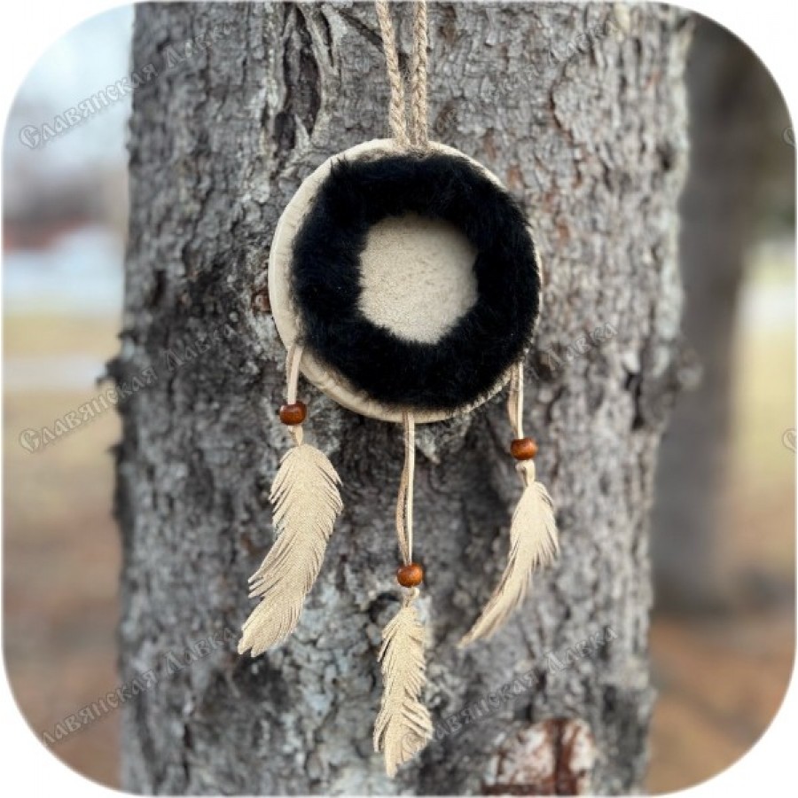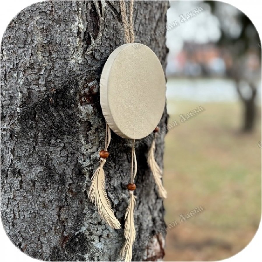 Этот образ – словно загадка, разбивающая привычные рамки восприятия. С первого взгляда – бубен, зовущий в шаманский транс. Но стоит присмотреться – и перед тобой уже изящный ловец снов, сотканный из нитей этнической самобытности. Ручная работа чувствуется в каждом штрихе, в каждой мельчайшей детали, выполненной с неистовым мастерством. Это действительно бубен в миниатюре, созданный по всем канонам древнего ремесла: натянутая кожа, мех, шепчущий предания старины. И лишь оформление выдает в нем ловца снов – три кожаных пера, словно застывшие в полете, добавляют изделию легкости и воздушности. Так рождается уникальный сувенир: два оберега в одном.