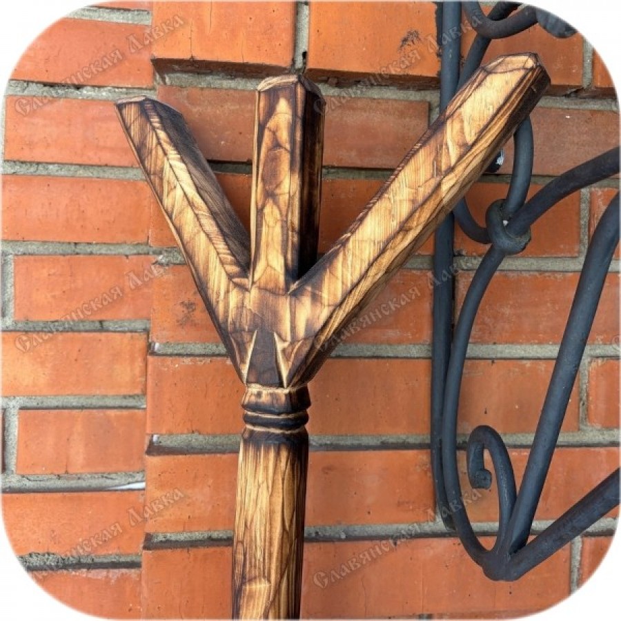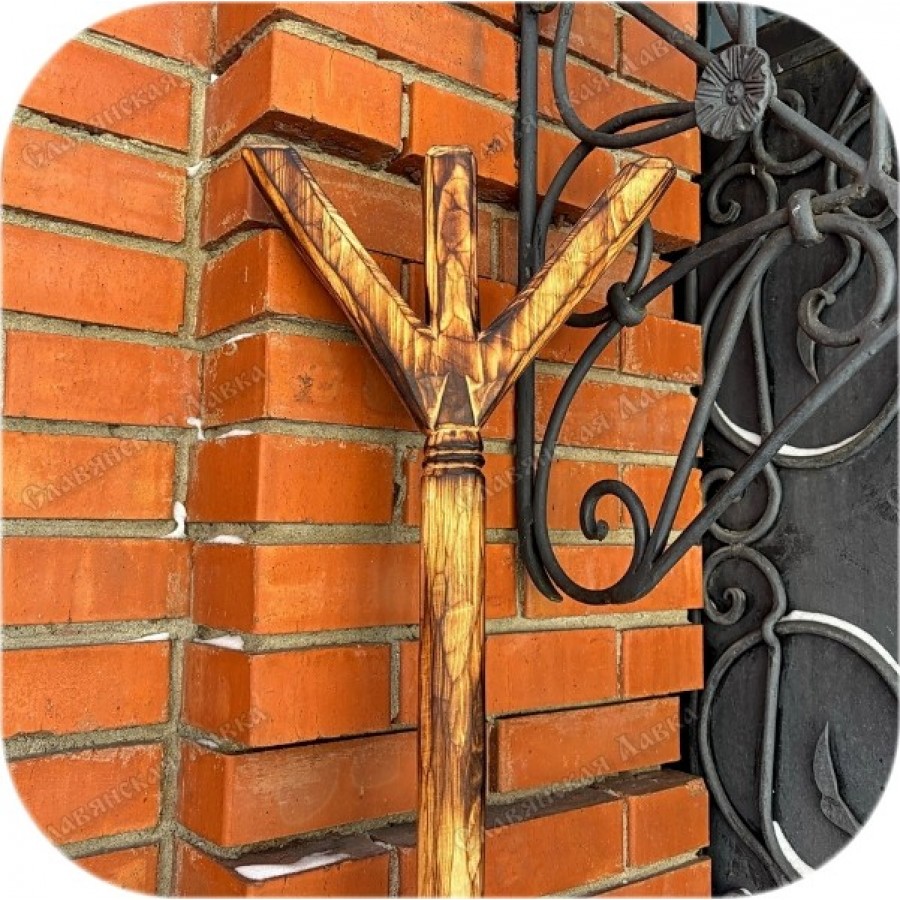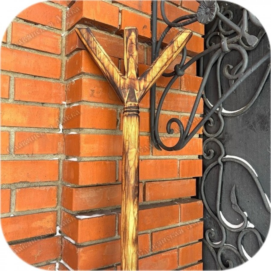 1. Форма трезубца: Посох выполнен в форме трезубца, символизирующего славянскую руну «Мир». Эта руна воплощает понятия добра, света и всего истинно человеческого, что присутствует в природе.