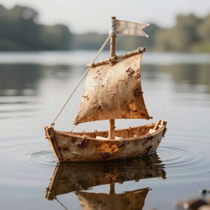 В полученное отверстие вставляем тонкую проволочку или нитку (ванты), и закрепляем ее на корме и на парусе, фиксируя парус в нужном положении.