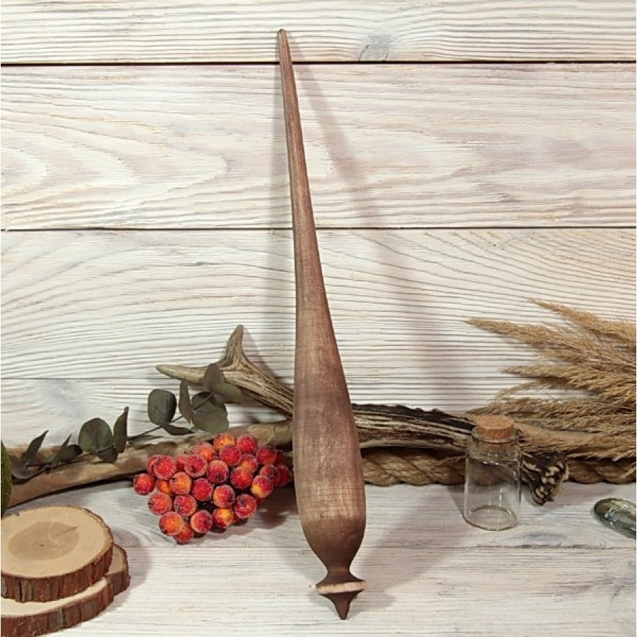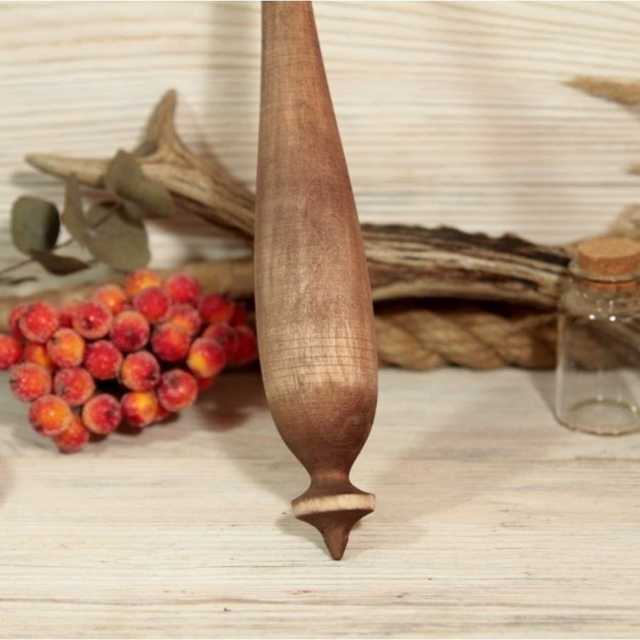 Веретено изготовлено в строгом соответствии с историческими канонами, что позволяет использовать его как по прямому назначению, так и в ритуальных целях. Древесина искусно тонирована в глубокий коричневый цвет и слегка состарена с помощью наждачной бумаги, дабы придать изделию благородный "эффект старины", напоминая о его богатой истории и связи с прошлыми поколениями.