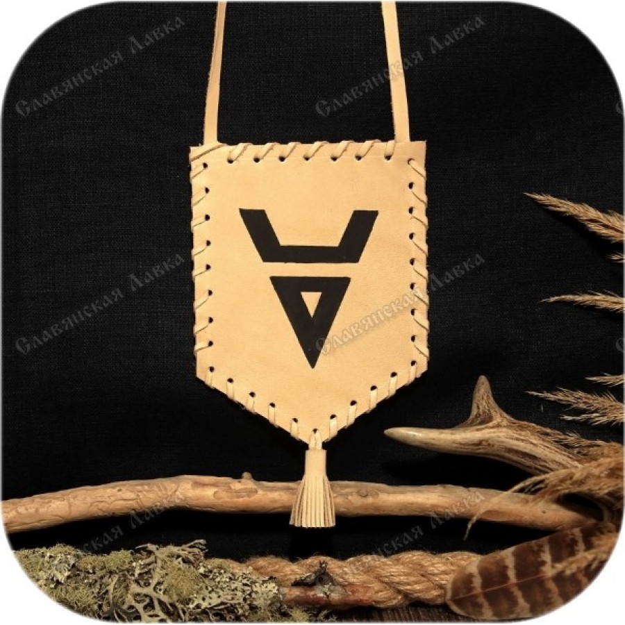 Представленный оберег выполнен в одностороннем варианте. Кожа искусно сшита таким образом, чтобы лицевая сторона украшала вымпел с обеих сторон, создавая ощущение цельности и гармонии. Отделка выполнена шнурком из той же кожи, а у основания располагается изящное украшение в виде кисти.